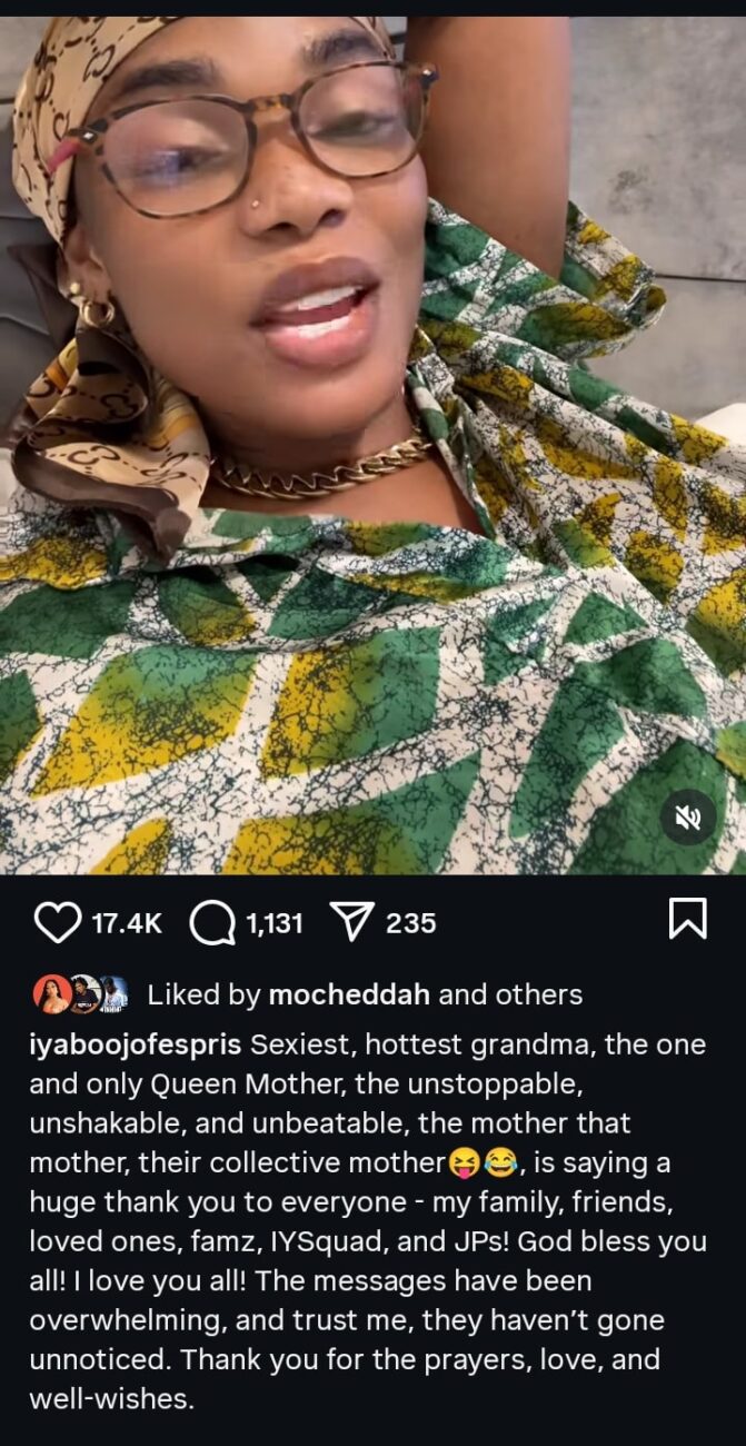 She wrote: “S3xiest, hottest grandma, the one and only Queen Mother, the unstoppable, unshakable, and unbeatable, the mother that mother, their collective mother, is saying a huge thank you to everyone – my family, friends, loved ones, famz, IYSquad, and JPs! God bless you all! I love you all! The messages have been overwhelming, and trust me, they haven’t gone unnoticed. Thank you for the prayers, love, and well-wishes”.