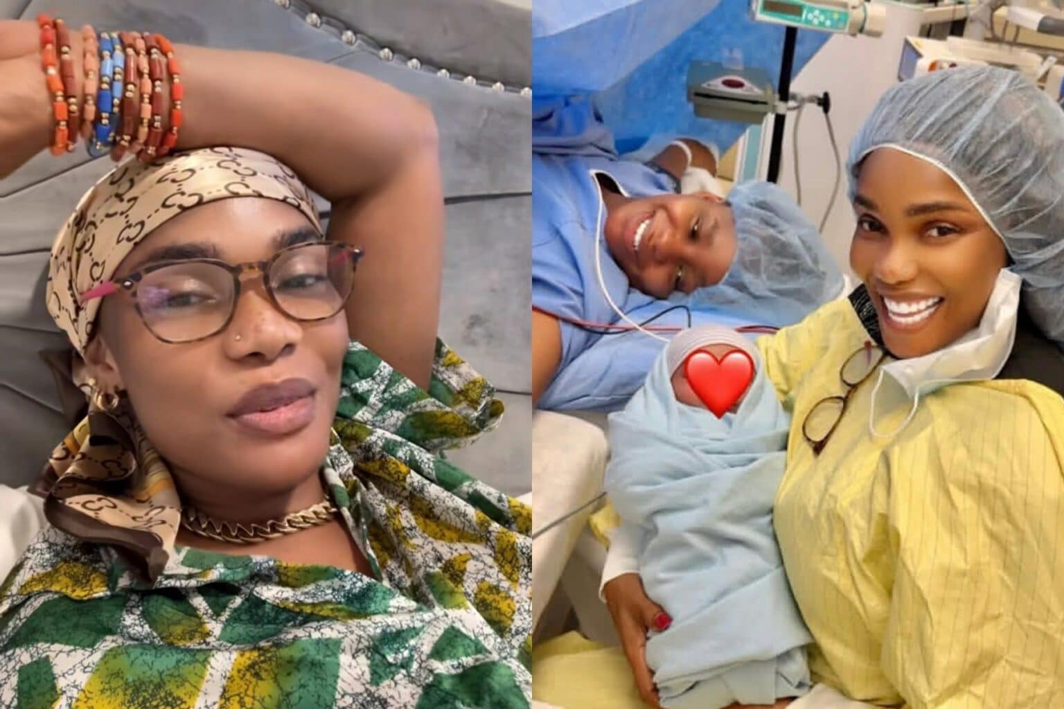 The proud grandma shared a photo of her, Priscilla and the baby in the labour room thanking God for safe delivery.