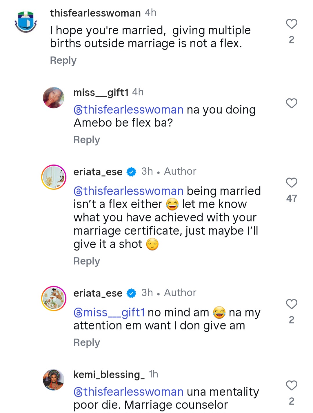 Eriata responded, telling them that marriage is not a flex and asking what they've achieved with their marriage.