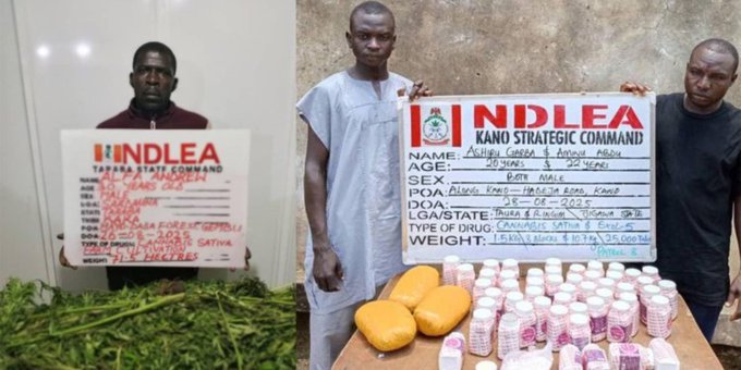 "In Kano, the duo of Ashiru Garba, 20, and Aminu Abdu, 22, were arrested on Tuesday 26th August along Kano-Hadeja road, with 1.5kg skunk and 25,000 pills of exol-5 while two other suspects: Ali Muhammad, 37, and Muhammad Maishanu, 42, were nabbed by NDLEA officers on Thursday 28th August along Zaria-Kano road, Gadan Tamburawa, with 8,080 bottles of a New Psychoactive Substance and 25.7kg skunk in their possession.”