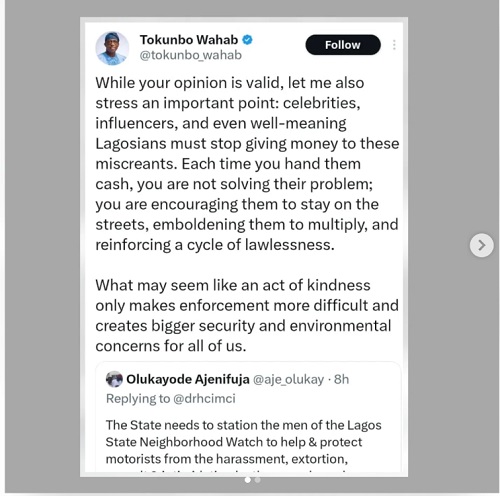 “Celebrities, influencers, and even well-meaning Lagosians must stop giving money to these miscreants. Each time you hand them cash, you are not solving their problem; you are encouraging them to stay on the streets, emboldening them to multiply, and reinforcing a cycle of lawlessness.