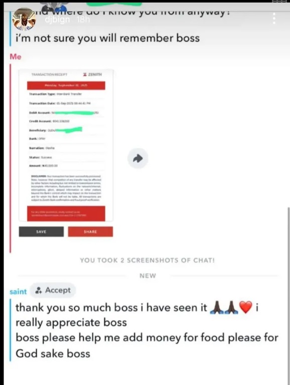 DJ Big N went ahead and sent him the money, but things took another turn when the fan came back asking for more cash—this time for food.