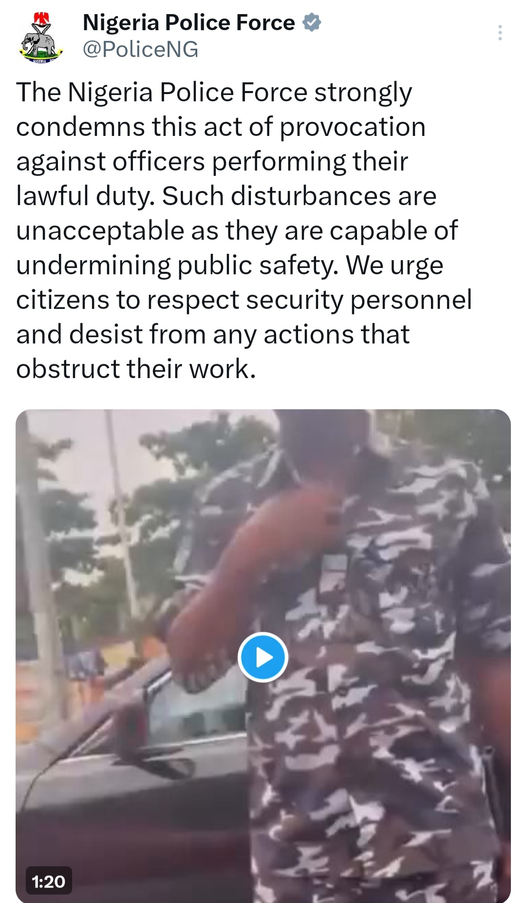 The NPF shared the video and wrote: "The Nigeria Police Force strongly condemns this act of provocation against officers performing their lawful duty. Such disturbances are unacceptable as they are capable of undermining public safety. We urge citizens to respect security personnel and desist from any actions that obstruct their work."