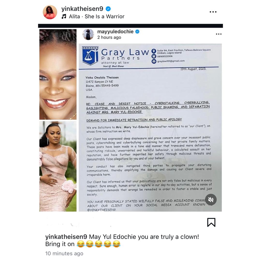 Linc Edochie’s ex, Yinka Theisen has replied May Edochie, estranged wife of actor, Yul Edochie.