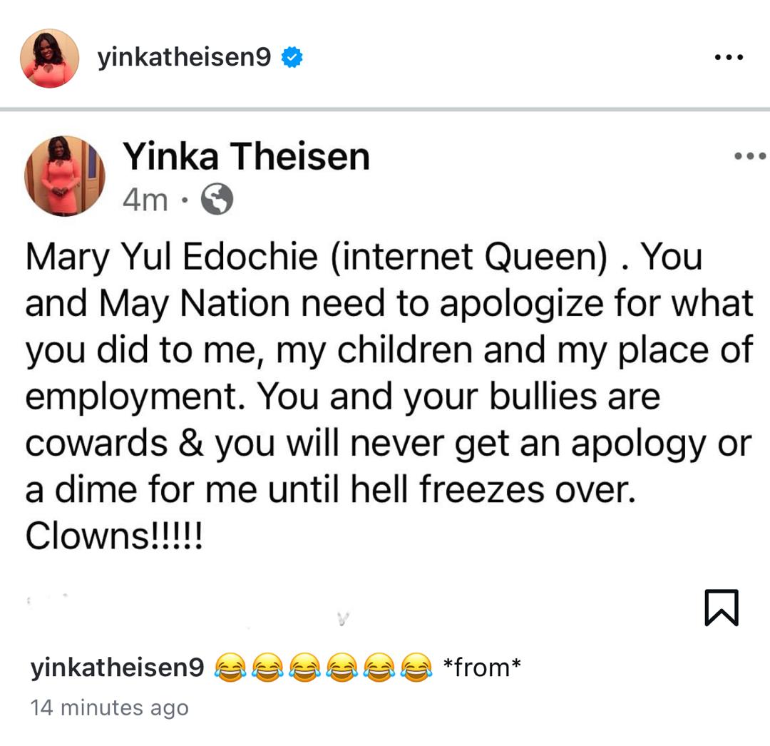 Yinka described May as a clown. She went further to say that May will never get an apology or a dime from her.