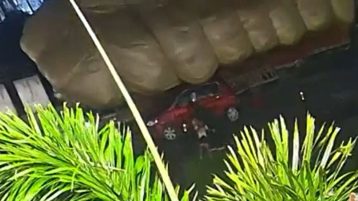 A family of four, including two adults and two children, narrowly escaped de@th when a fully-loaded truck crashed onto their car just moments after they had stepped out of it.
