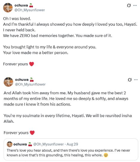 "He loved me so deeply & softly, and always made sure I knew it from his actions. You’re my soulmate in every lifetime, Hayati. We will be reunited insha Allah. Forever yours,” she wrote.