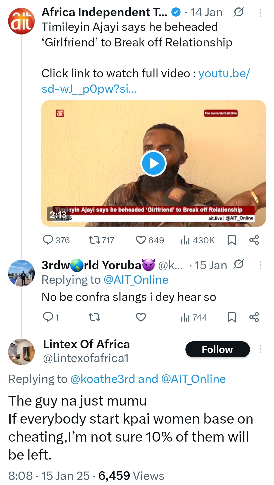 Another tweet shows him reacting to the interview gospel singer Timileyin Ajayi granted in January 2025 after he was caught with the severed head of a female corps member, Salome Adaidu.