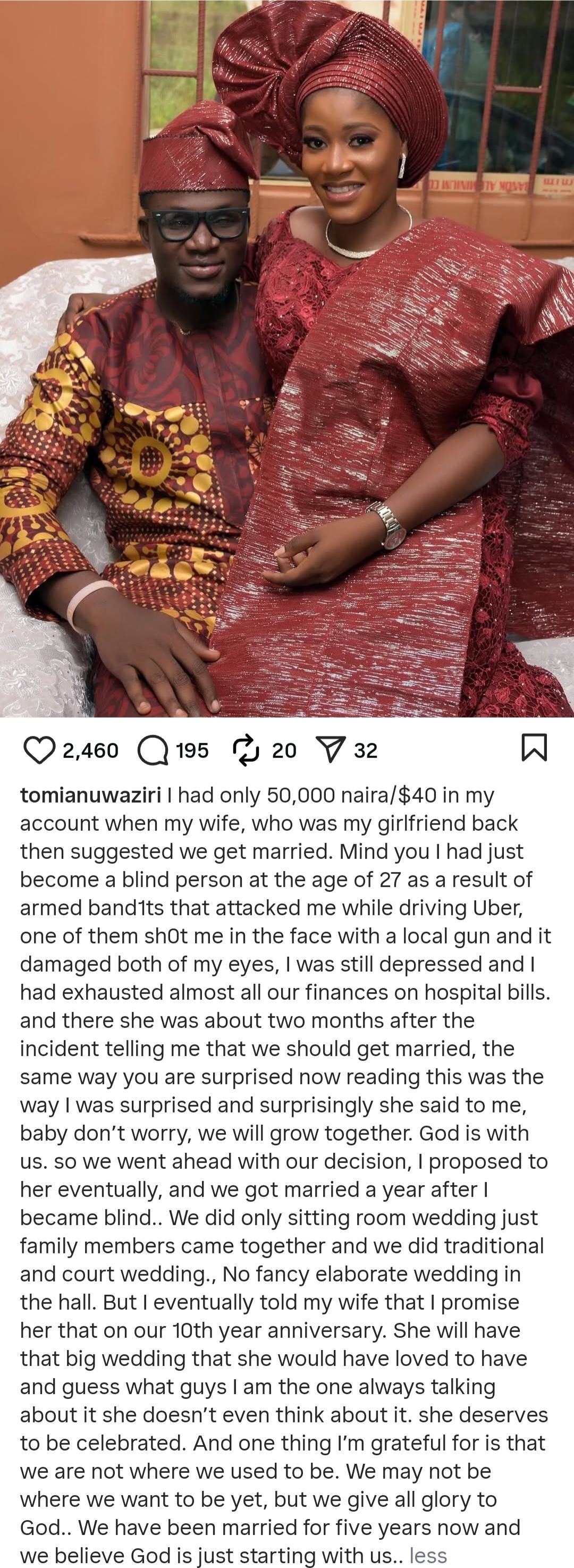 "Mind you I had just become a blind person at the age of 27 as a result of armed band1ts that attacked me while driving Uber, one of them sh0t me in the face with a local gun and it damaged both of my eyes, I was still depressed and I had exhausted almost all our finances on hospital bills. and there she was about two months after the incident telling me that we should get married, the same way you are surprised now reading this was the way I was surprised and surprisingly she said to me, baby don’t worry, we will grow together. God is with us. so we went ahead with our decision,