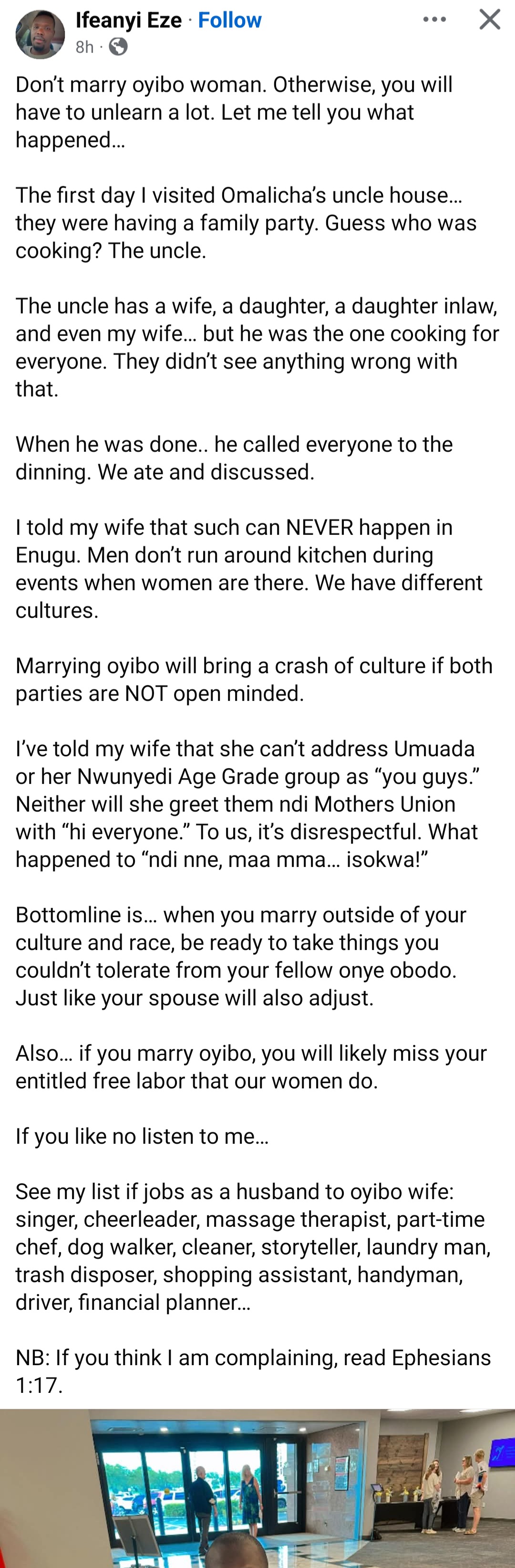 "I told my wife that such can NEVER happen in Enugu. Men don’t run around kitchen during events when women are there. We have different cultures.