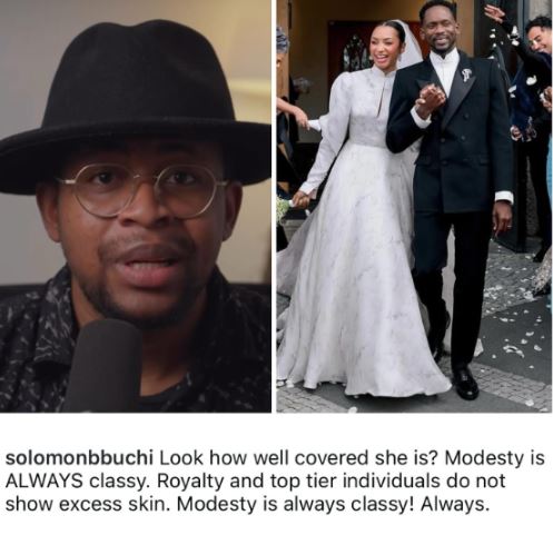 Solomon Buchi, the Nigerian social media commentator, has applauded Temi Otedola Ajibade for her modest choice of attire at her wedding to Mr. Eazi.
