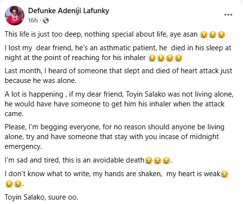 Funke added that his d3ath could have been avoided if he was living with someone.