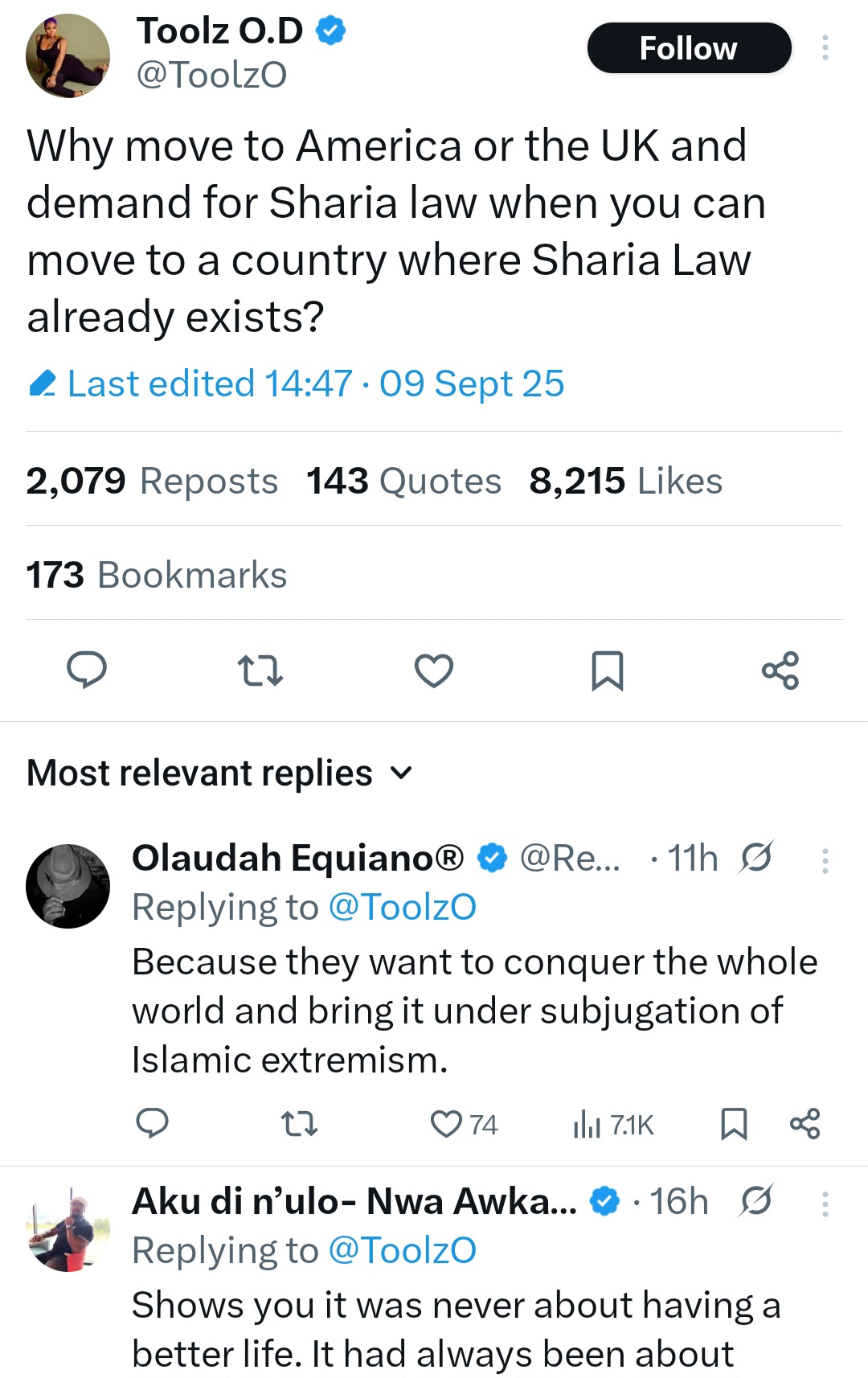 Toolz questioned why such people do not just move to countries where Sharia law already exists.