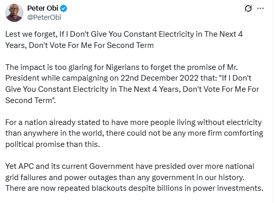 In his post, Obi argued that the APC and the president government have presided over more national grid failures and power outages than any government in Nigeria's history.