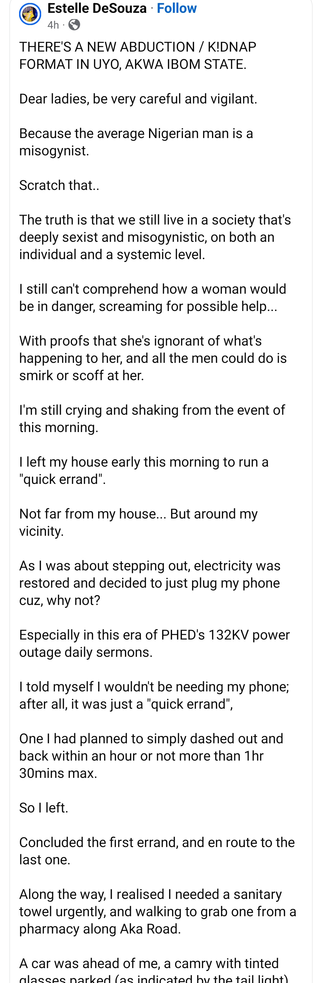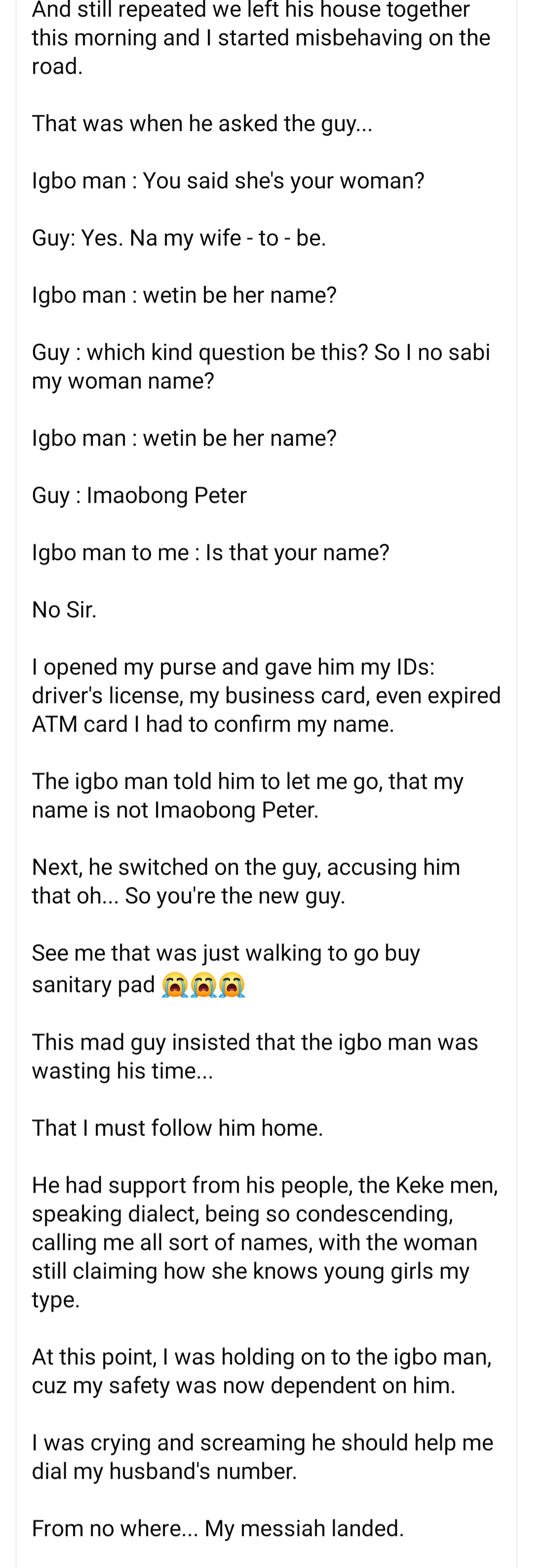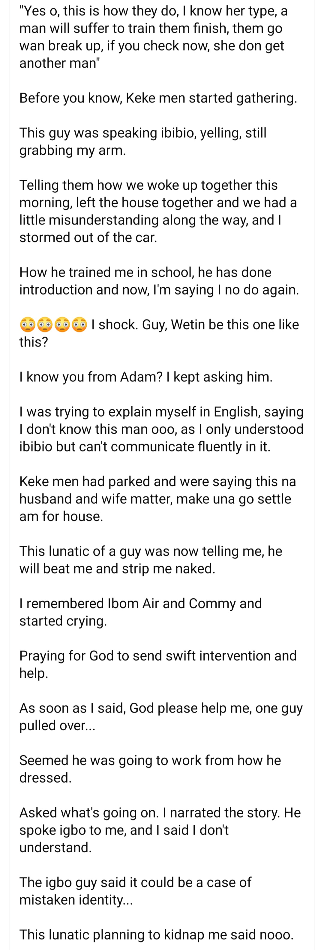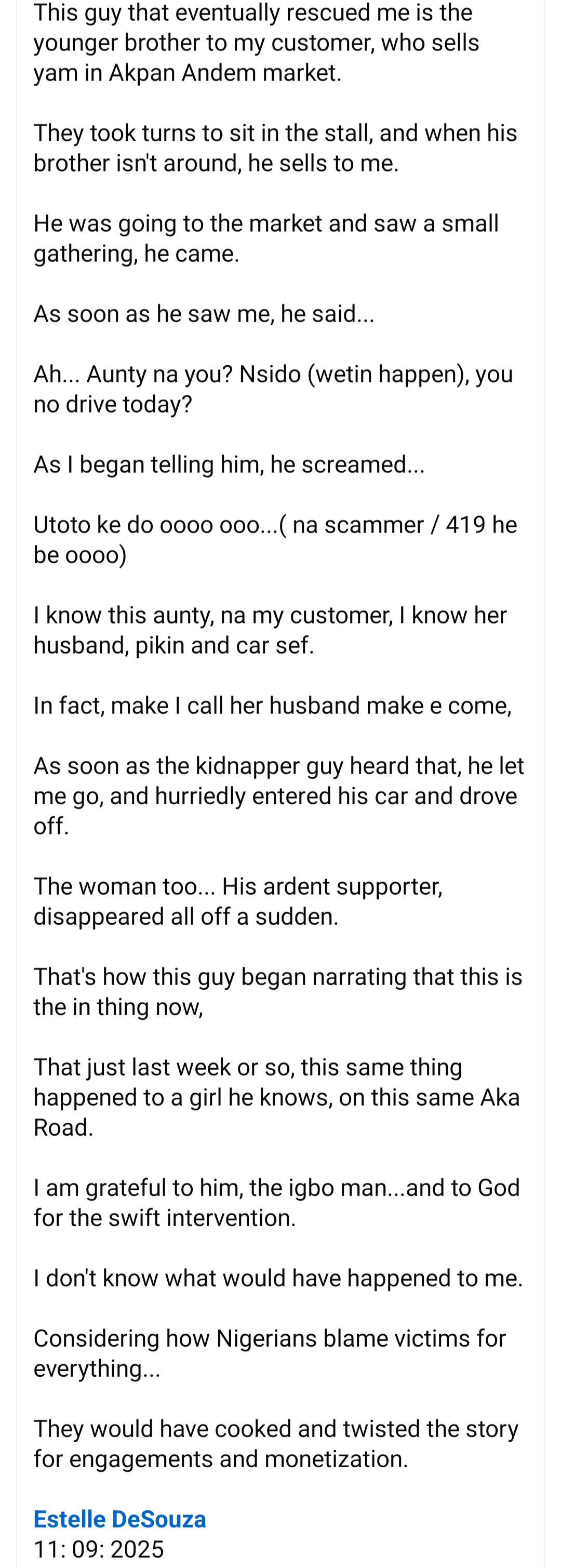 As she cried for help, she said no one attempted to help her and the man was almost carrying her off when an Igbo man parked his car and intervened. When the Igbo man asked the kidnapper for the woman's name, he gave the wrong name and the woman provided her ID to prove that's not her name.