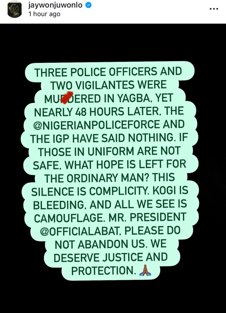 In the post shared on social media, Jaywon accused the IGP and the Police force for being silent despite the k!lling of the officers.