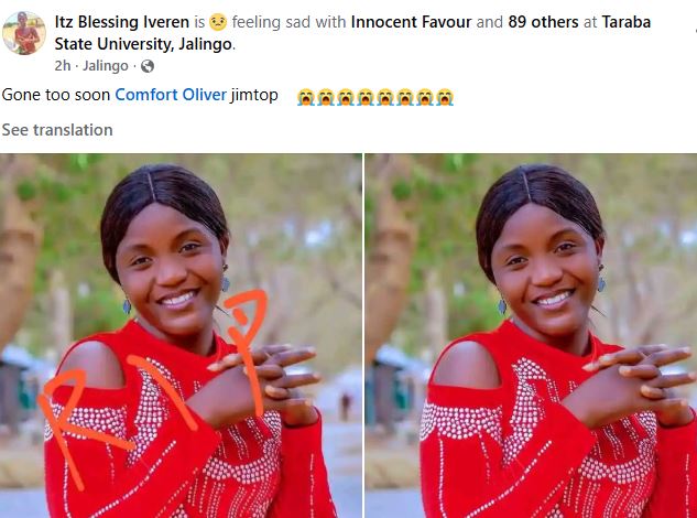 A 100-level student of Taraba State University (TSU), Comfort Jimtop Oliver, has tragically passed away at her boyfriend’s residence in Jalingo.