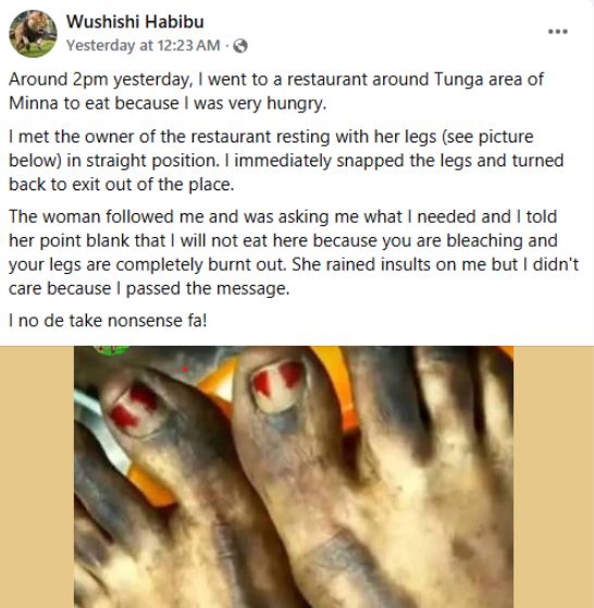 Habibu Abubakar Wushishi, Director of Media and Strategy at the Niger State Ministry of Humanitarian Affairs and Disaster Management, alleged that a woman insulted him after he declined to eat at her restaurant because she “bleaches her skin.”