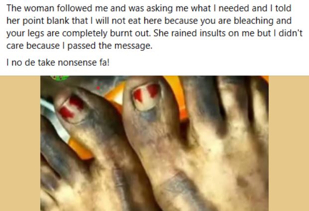 The woman followed me and was asking me what I needed and I told her point blank that I will not eat here because you are bleaching and your legs are completely burnt out. She rained insults on me but I didn't care because I passed the message. I no de take nonsense."