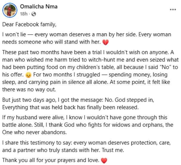 A Nigerian widow, Uba Chidinma, has shared her ordeal with a man who, she alleged, attempted to victimize her and seized her source of livelihood after she rejected his ‘offer.’