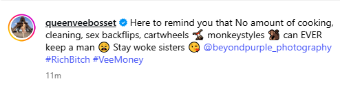 She stated this in an Instagram post on Monday, September 15, 2025 and wrote: “Here to remind you that no amount of cooking, cleaning, cartwheels, monkey styles can EVER keep a man. Stay woke, sisters.”