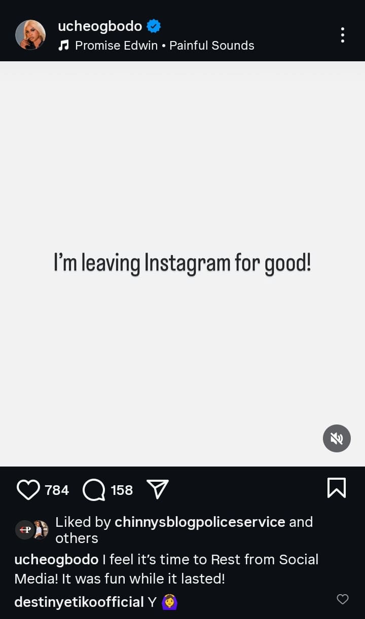 Uche said it’s time for her to rest from social media, as it was fun while it lasted.