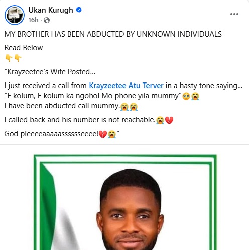 According to Benue activist, Ukan Kurugh, Terver's wife said he called her before his phone line went off, saying he had been kidnapped and asked that his mother be informed.