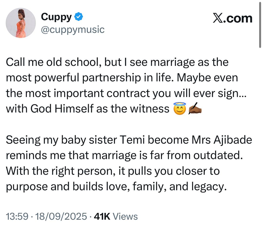 DJ Cuppy in a post on X stated that marriage in her opinion might be the most important contract one could sign.