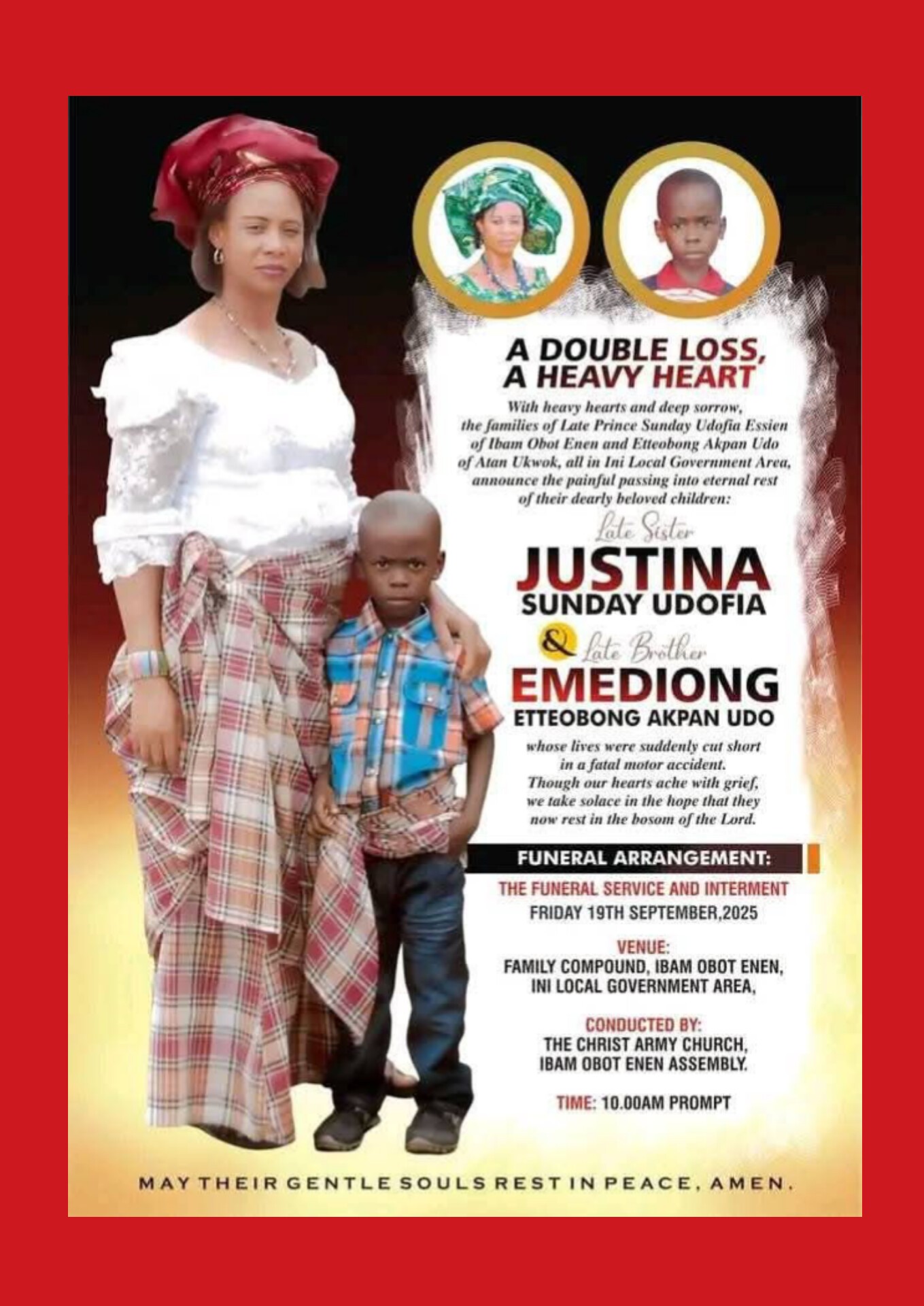 A mother and her son k!lled by a drunk driver is set to be buried on Friday, September 19, in Akwa Ibom State.
