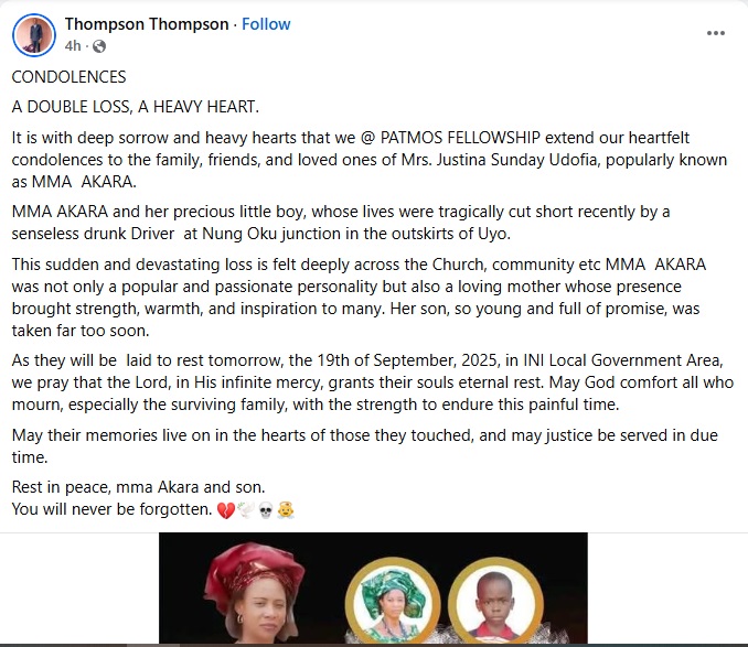“It is with deep sorrow and heavy hearts that we @ PATMOS FELLOWSHIP extend our heartfelt condolences to the family, friends, and loved ones of Mrs. Justina Sunday Udofia, popularly known as MMA AKARA,” he wrote.
