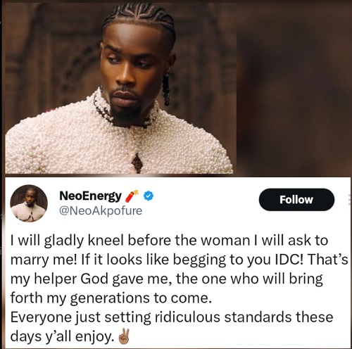 In a post on X, he wrote: “I will gladly kneel before the woman I will ask to marry me! If it looks like begging to you, IDC! That’s my helper God gave me, the one who will bring forth my generations to come. Everyone just setting ridiculous standards these days y’all enjoy.”