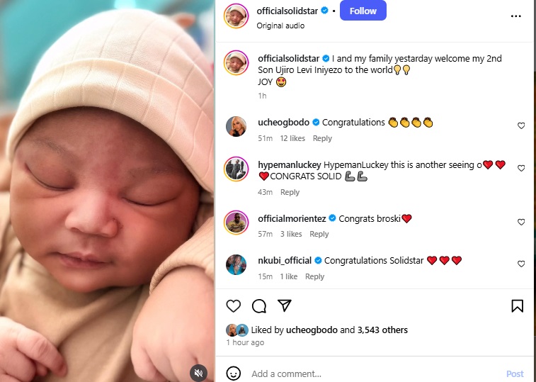 ‘’I and my family yesterday welcome my 2nd Son Ujiro Levi Iniyezo to the world
