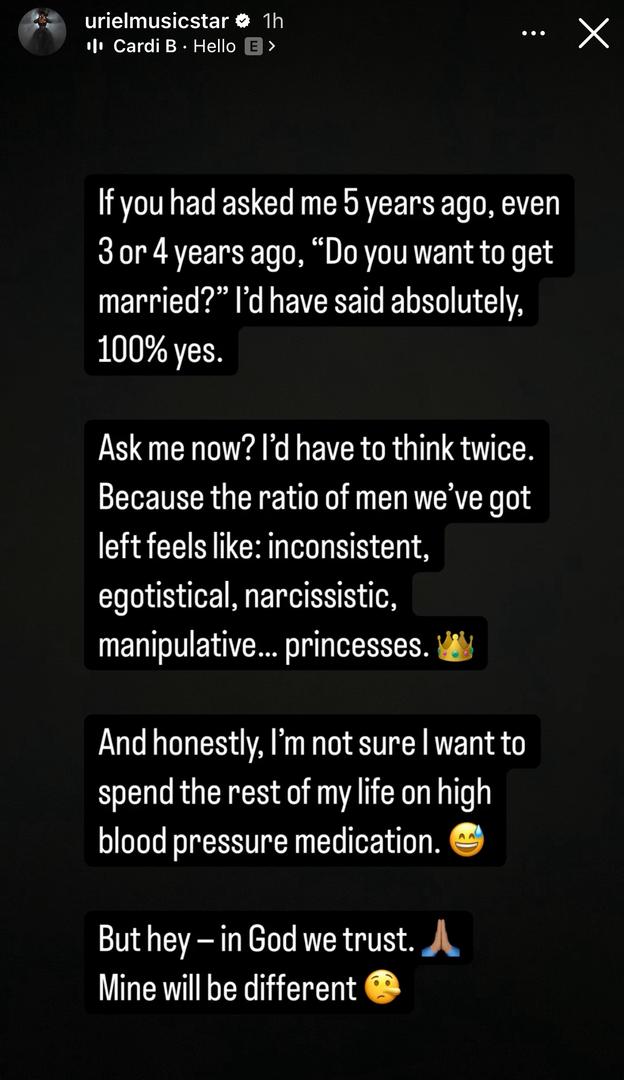 In a post shared on her Instagram page, Uriel opined that majority of the men out in the dating pool are “inconsistent, egotistical, narcissistic, manipulative and princesses.”