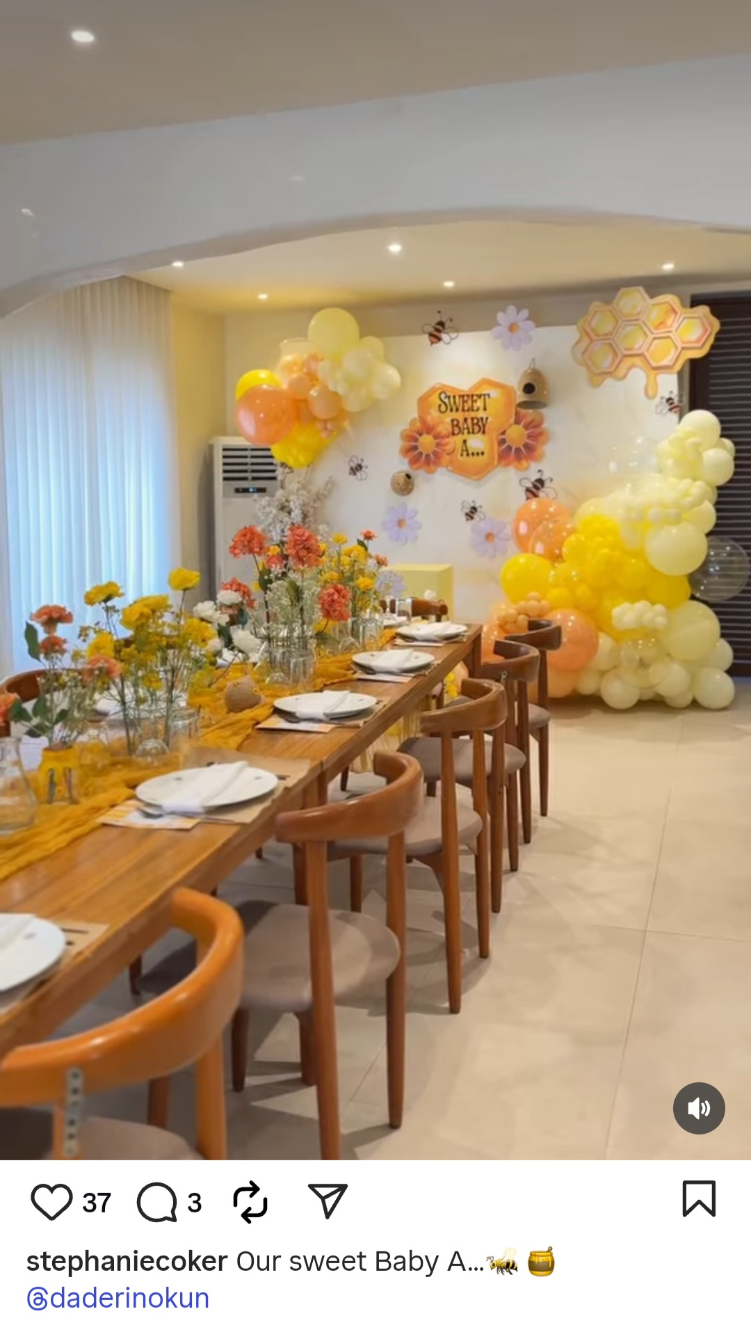 She shared a video from her and husband Olumide Aderinokun's bee-themed baby shower and wrote: "Our sweet Baby A."