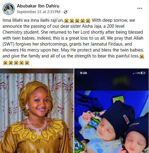 “Inna lillahi wa inna ilaihi raji’un. It is on a sad note, we announce the passing of our dear sister Aisha Jaja, a 200 level Chemistry student.