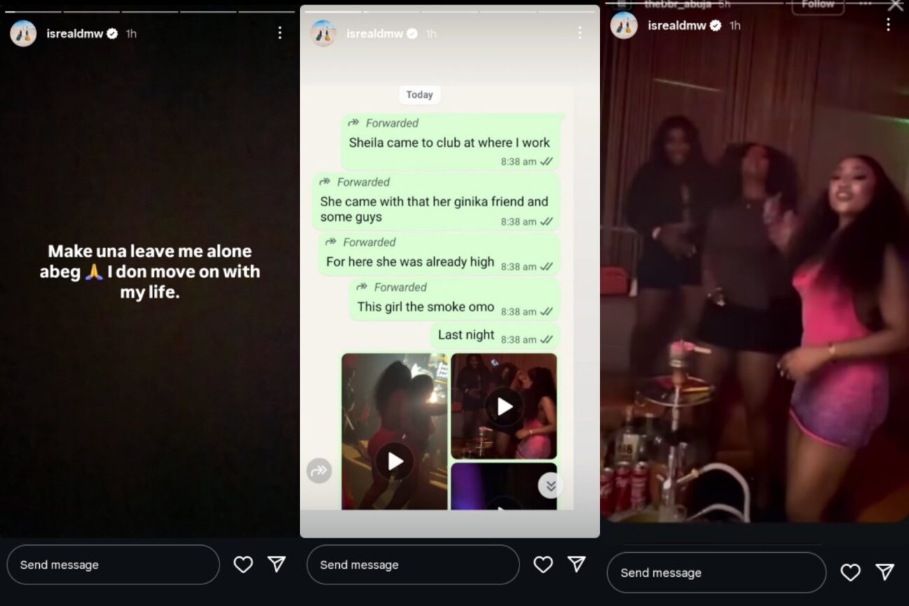 Speaking in a post via his Instagram story, Israel shared a screenshot of the message he received from an unidentified person, informing him that Sheila was at the club where he works.