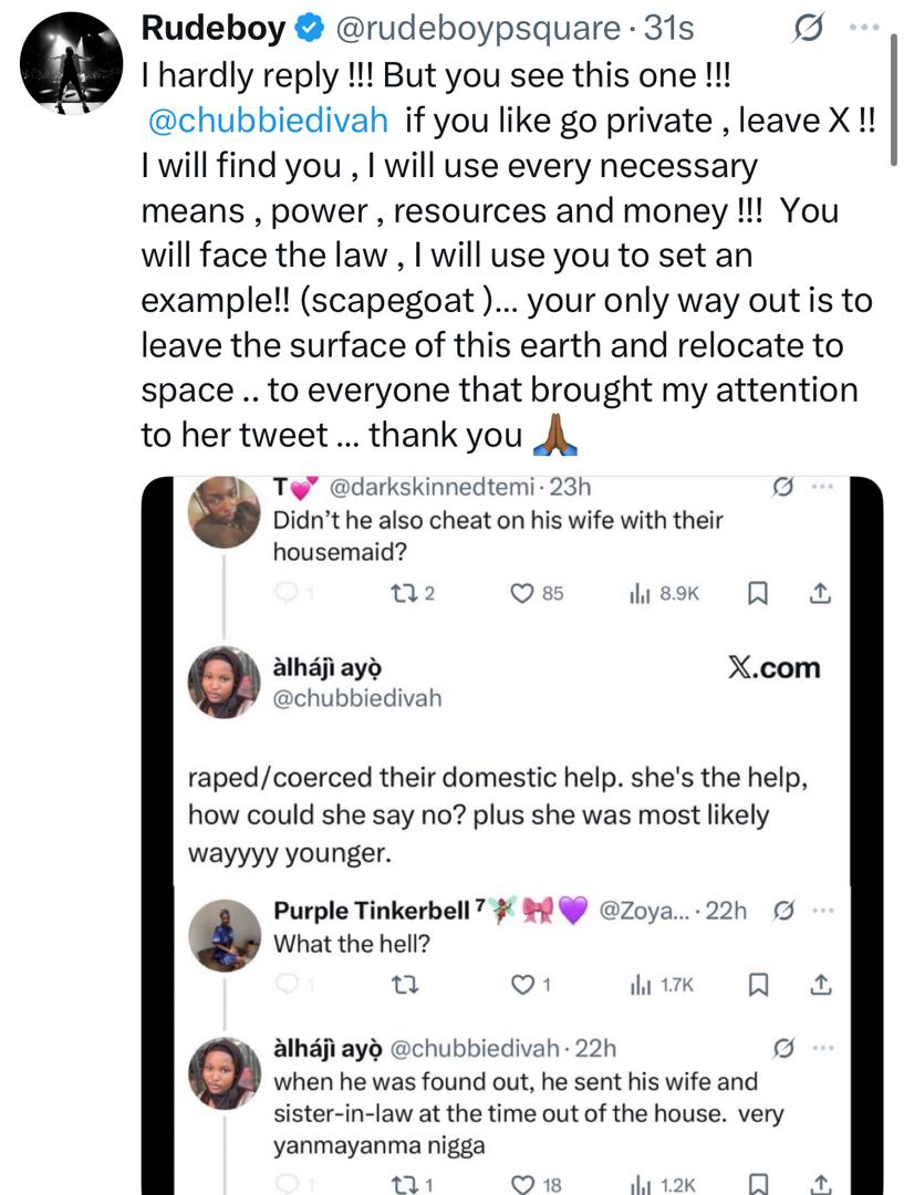 Responding this evening, Rudeboy vowed to use everything within his power, to ensure the X user faces the law.