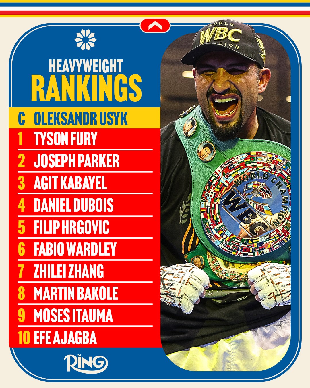 Right behind him is Tyson Fury at No. 1, still considered the biggest threat to Usyk after their unforgettable clash.