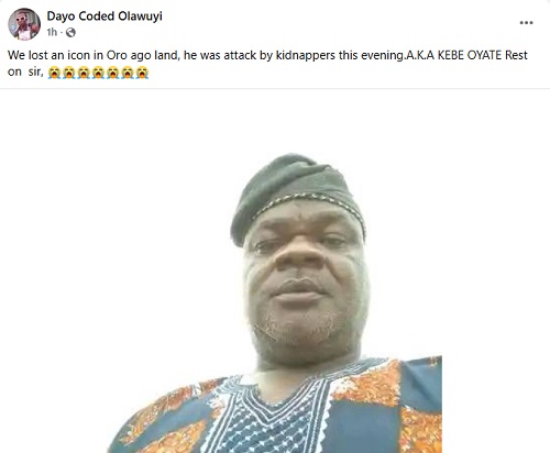 A hotelier, Chief David Oladepo Aina, alias Kebe from Oro Ago community in Irepodun Local Government Area of Kwara State has been k!lled.