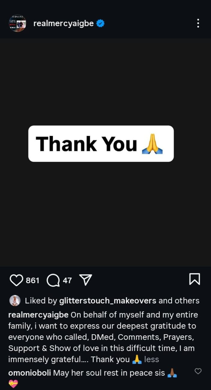 Nollywood actress Mercy Aigbe Adeoti has shared a heartfelt note thanking the public for their messages following the d3ath of her mother.