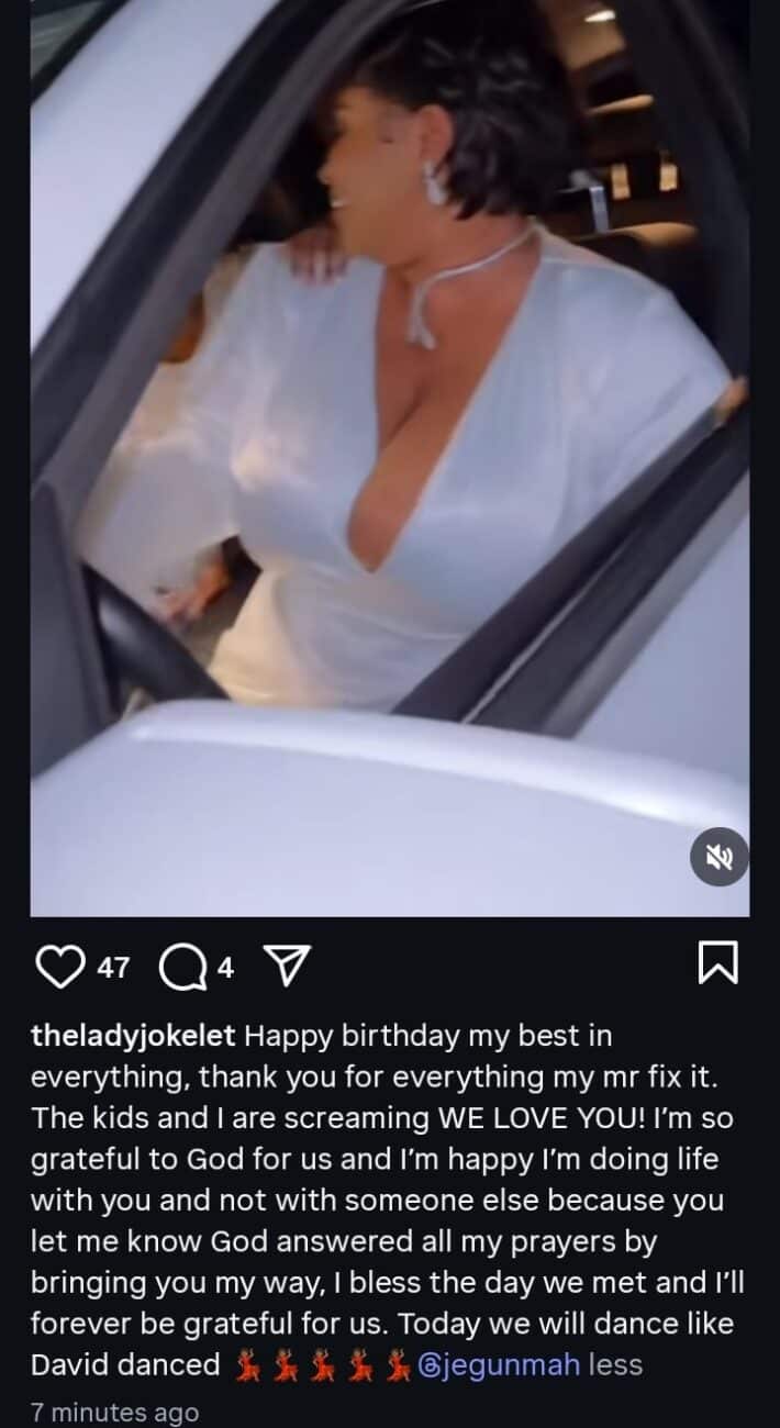 “Happy birthday, my best in everything, thank you for everything, my Mr Fix-it. The kids and I are screaming WE LOVE YOU! I’m so grateful to God for us, and I’m happy that I’m doing life with you and not with someone else, because you let me know that God answered all my prayers by bringing you my way. I bless the day we met, and I’ll forever be grateful for us. Today, we will dance like David danced