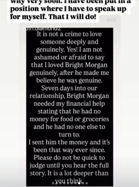 She further claimed that only seven days into their relationship, Bright asked her for financial help, saying he had no money for food or groceries. She admitted she supported him since then, stressing that her love for him was genuine but insisting the full story is “a lot deeper” than people think.
