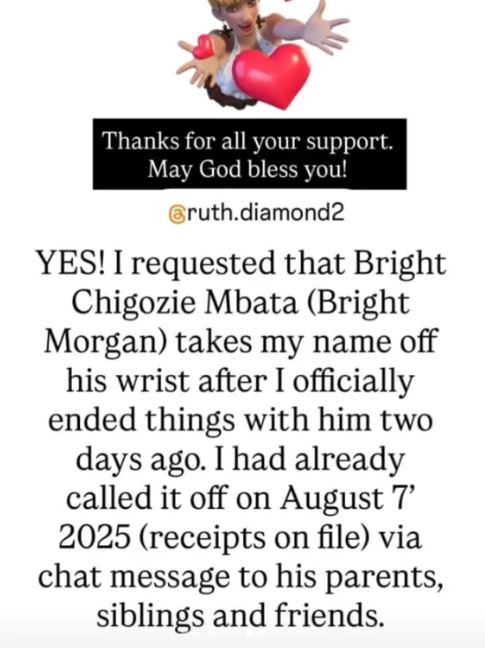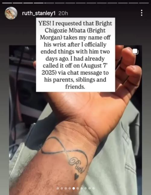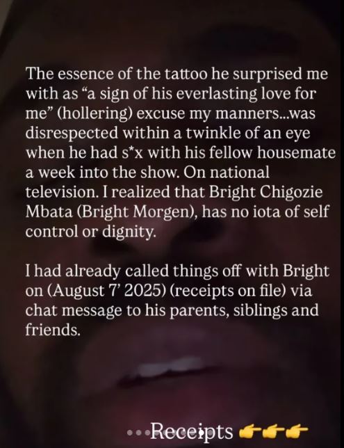 According to her, she officially ended things with him on August 7, 2025, and even requested that he take her name off his wrist tattoo just two days ago. She revealed she had receipts of informing his parents, siblings, and friends when she walked away.