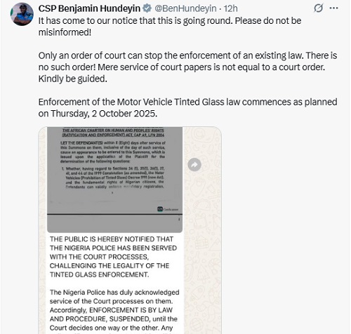The spokesperson of the Nigeria Police Force, CSP Benjamin Hundeyin has given reason why the police will resume enforcement of Motor Vehicle Tinted Glass law on Thursday, 2 October 2025.