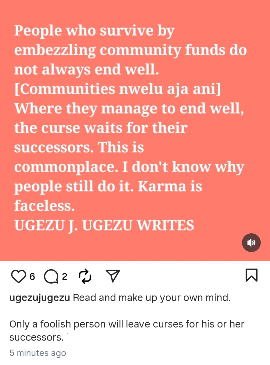 He reiterated that communities have spiritual laws governing them and those who embezzle public funds either end badly or their successors suffer the consequences.