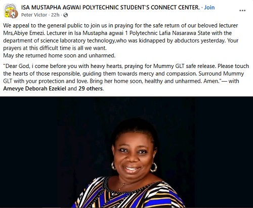 Similarly, gunmen have also kidnapped on Saturday night was a lecturer with the state-owned Isa Mustapha Agwai Polytechnic, Lafia, Mrs. Abiye Emezi, in Shabu.