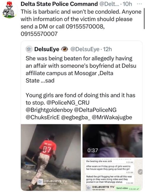 In a post shared on its X handle, the Delta State Police condemned the incident and has called on the public to share any details about the victim via DM or by contacting 09155570007.