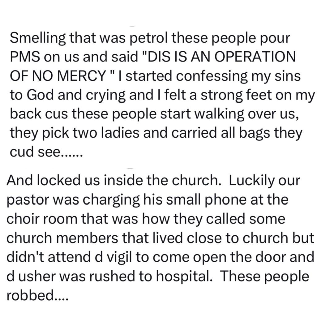 A Nigerian lady has lamented on social media how church members were r@ped by armed robbers.