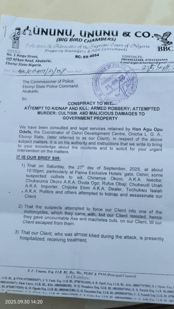 The Coordinator of Oshiri Development Centre in Onicha Local Government Area of Ebonyi State, Hon. Agu Opu Odefa, has filed a petition with the state’s Commissioner of Police, alleging a violent attempt on his life by suspected cultists.