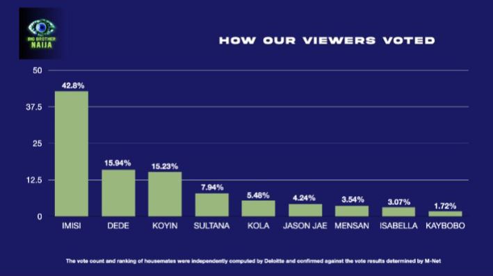 The organisers of Big Brother Naija Season 10, dubbed 10/10 released the chart following the emergence of Imisi as the ultimate winner of the show.